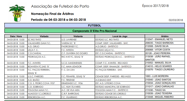 O Conselho de Arbitragem da AF Porto divulgou os árbitros nomeados para a 23ª jornada da Elite, a disputar no próximo domingo, dia 4 de Março. Para o derby concelhio, Vitor Costa foi o escolhido para dirigir este encontro. Já no derby gaiense, que vai pôr frente a frente o Avintes e Dragões Sandinenses, vai ser apitado por Manuel Silva. Confira, em baixo, as nomeações para a 23ª jornada: