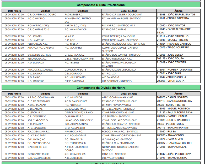 A AF Porto já disponibilizou os árbitros nomeados para os jogos da da Divisão Elite e da Divisão de Honra, que se realizam este domingo. Confira, em baixo: